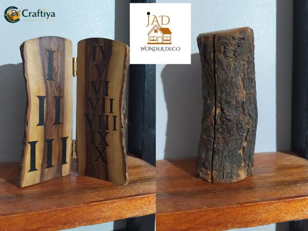 Objet décoratif artisanal réalisé à partir de bois naturel brut, conservant son écorce d’origine pour un rendu authentique et unique. L’intérieur est finement travaillé et gravé avec des chiffres romains, apportant une touche élégante et artistique.