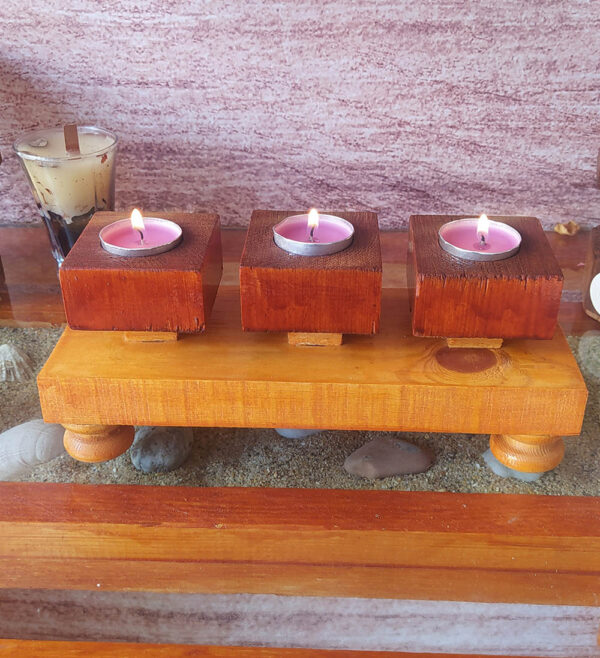 Bougeoir artisanal fabriqué à la main en bois naturel, composé de trois supports individuels pour bougies chauffe-plat, montés sur une base en bois solide et stable. Son design épuré et chaleureux met en valeur le caractère authentique du bois et apporte une ambiance douce et apaisante à votre intérieur.